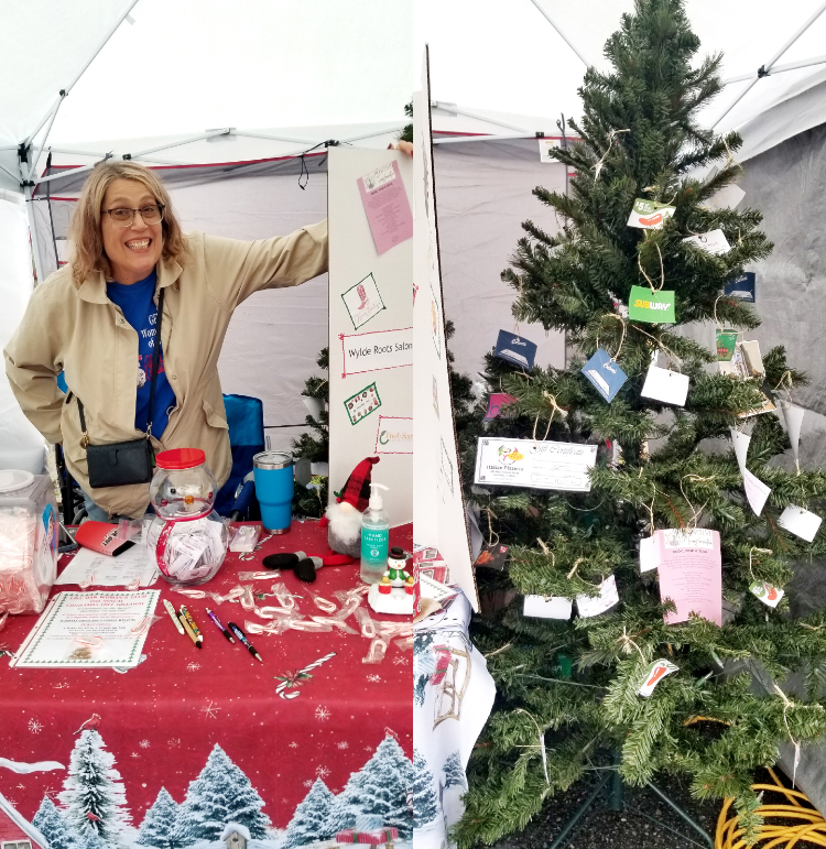 Woman’s Club representative Roberta Thomas, left. The Live Oak Woman’s Club was selling tickets for the raffle of two Christmas trees, each filled with $600 worth of gift cards from local businesses.